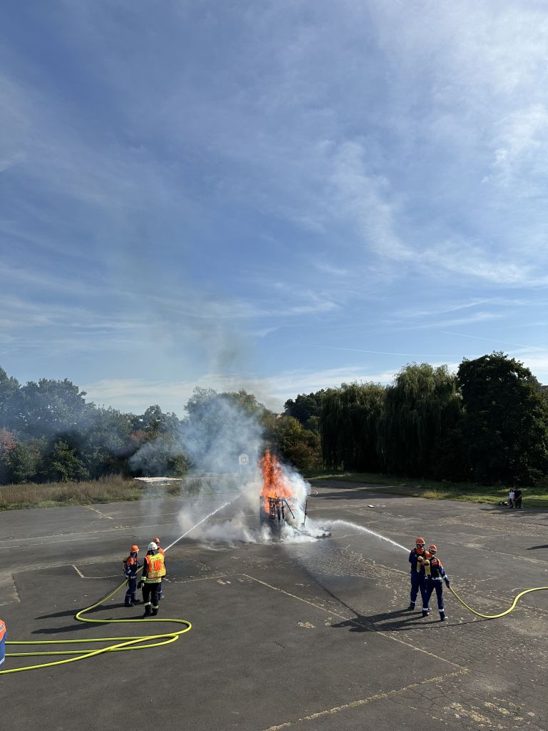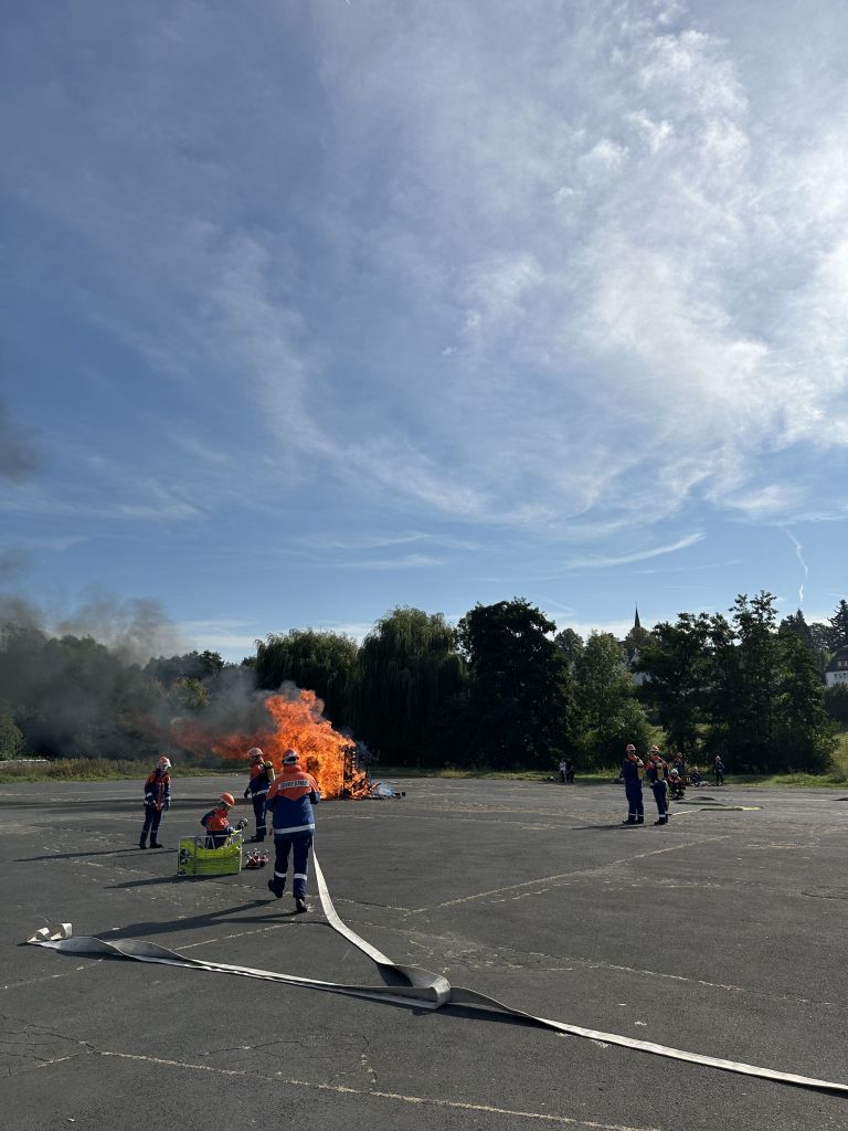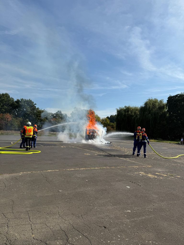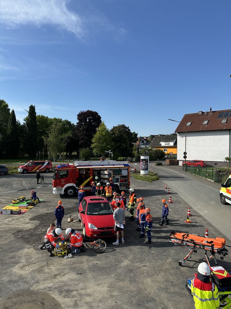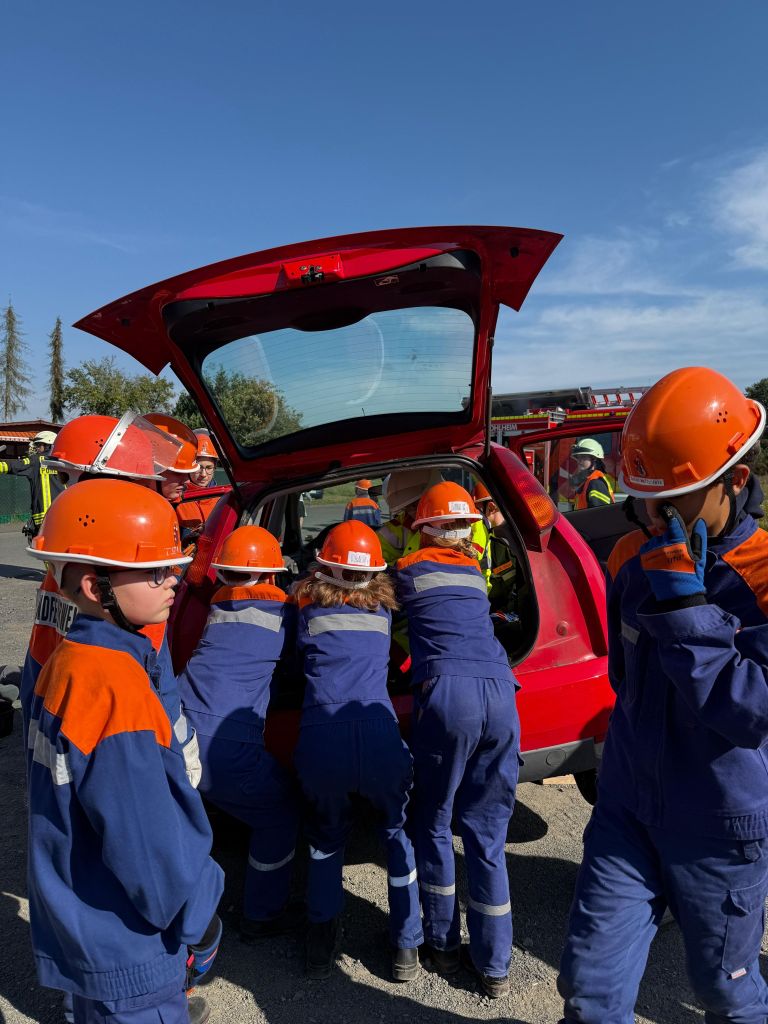 Doch damit nicht genug: Noch während der Anfahrt zum Brand wurde ein weiterer Einsatz gemeldet. Ein Radfahrer war unter einem Auto eingeklemmt und musste befreit werden. Parallel galt es, eine verletzte Person aus dem Fahrzeug zu retten. Mit viel Konzentration meisterten die Jugendlichen auch diese Herausforderung.