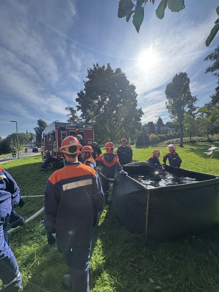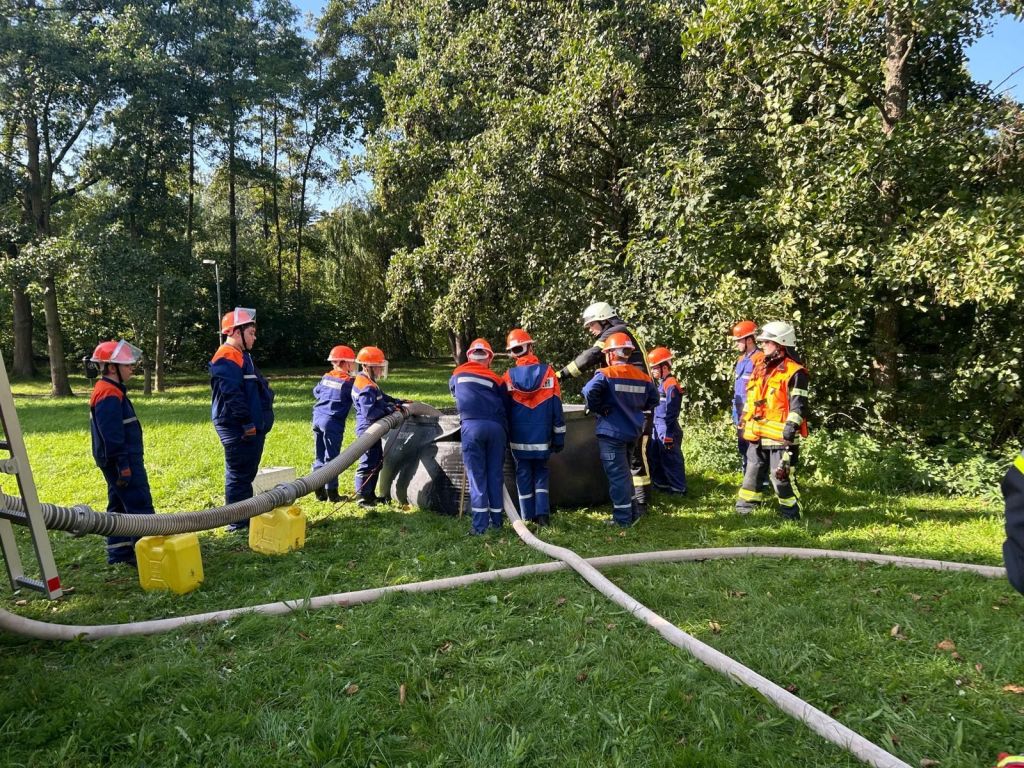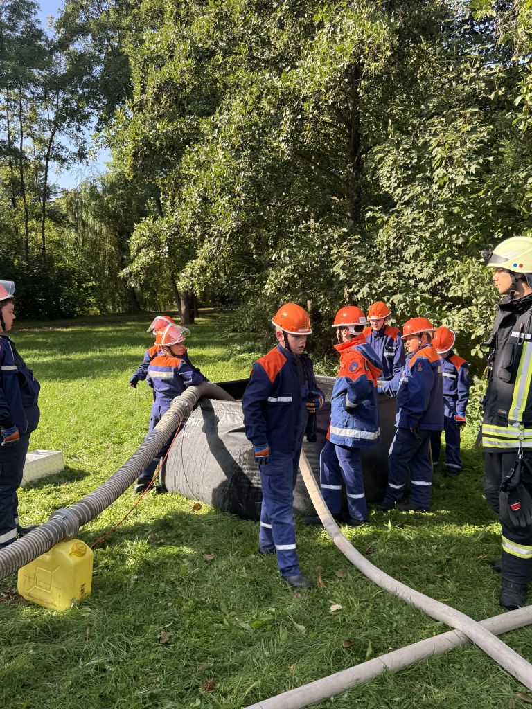 Das Übungsszenario hatte es in sich: Angenommen wurde ein Gartenhüttenbrand mit Menschenleben in Gefahr. Beim Eintreffen der Einsatzkräfte stand das Gebäude bereits in voller Ausdehnung in Flammen. Die Jugendlichen bauten die Wasserversorgung über eine lange Wegstrecke auf und entnahmen das Löschwasser aus einem offenen Gewässer.