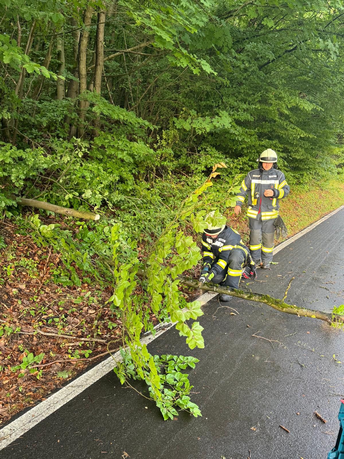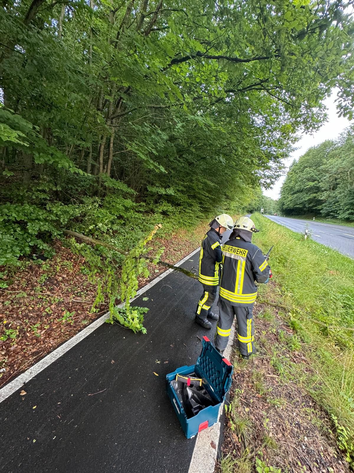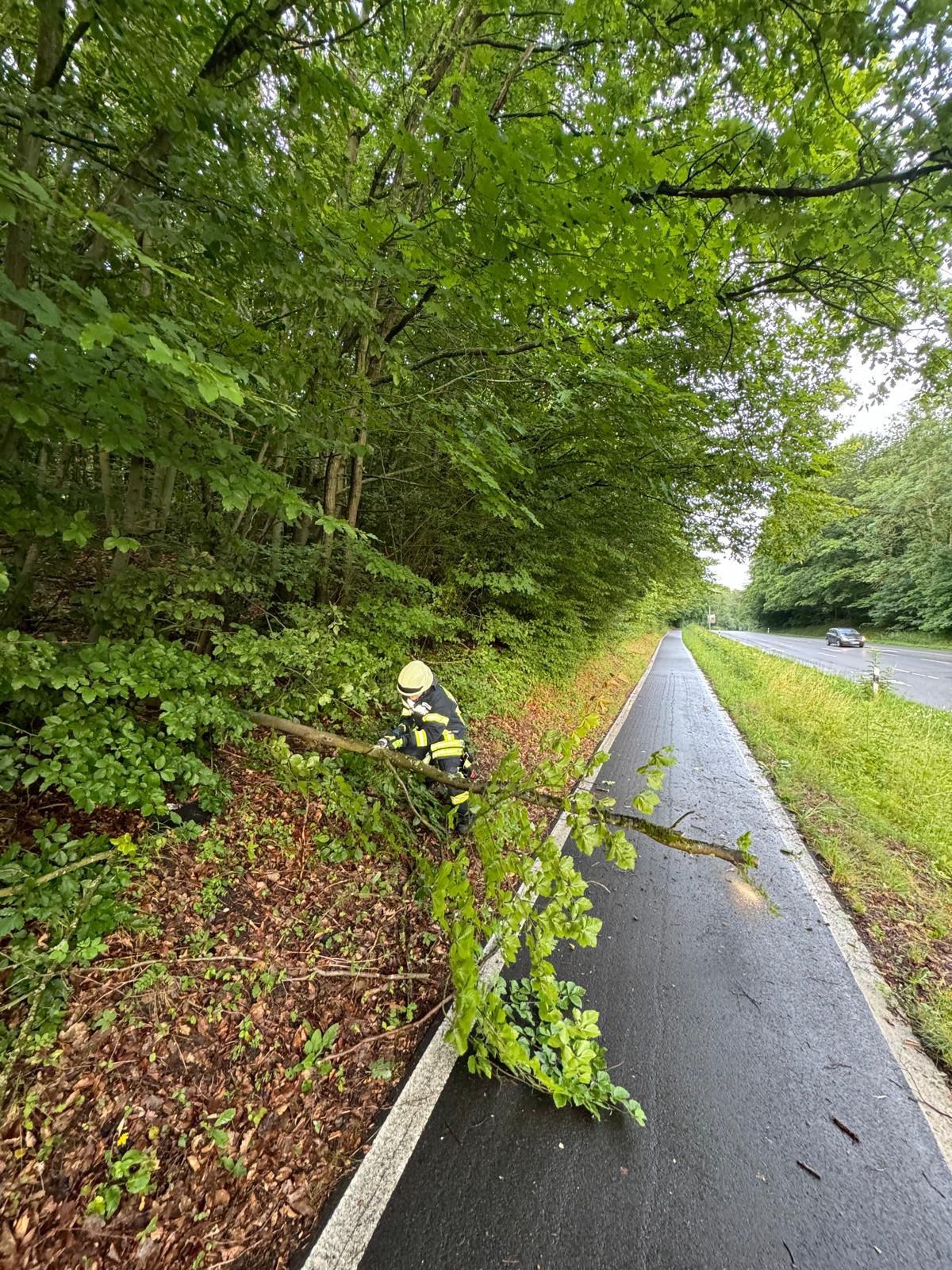 Nach kurzem Starkregen lag ein Baum auf dem Radweg. Der Baum wurde mit einer Säbelsäge zerkleinert und beseitigt.
