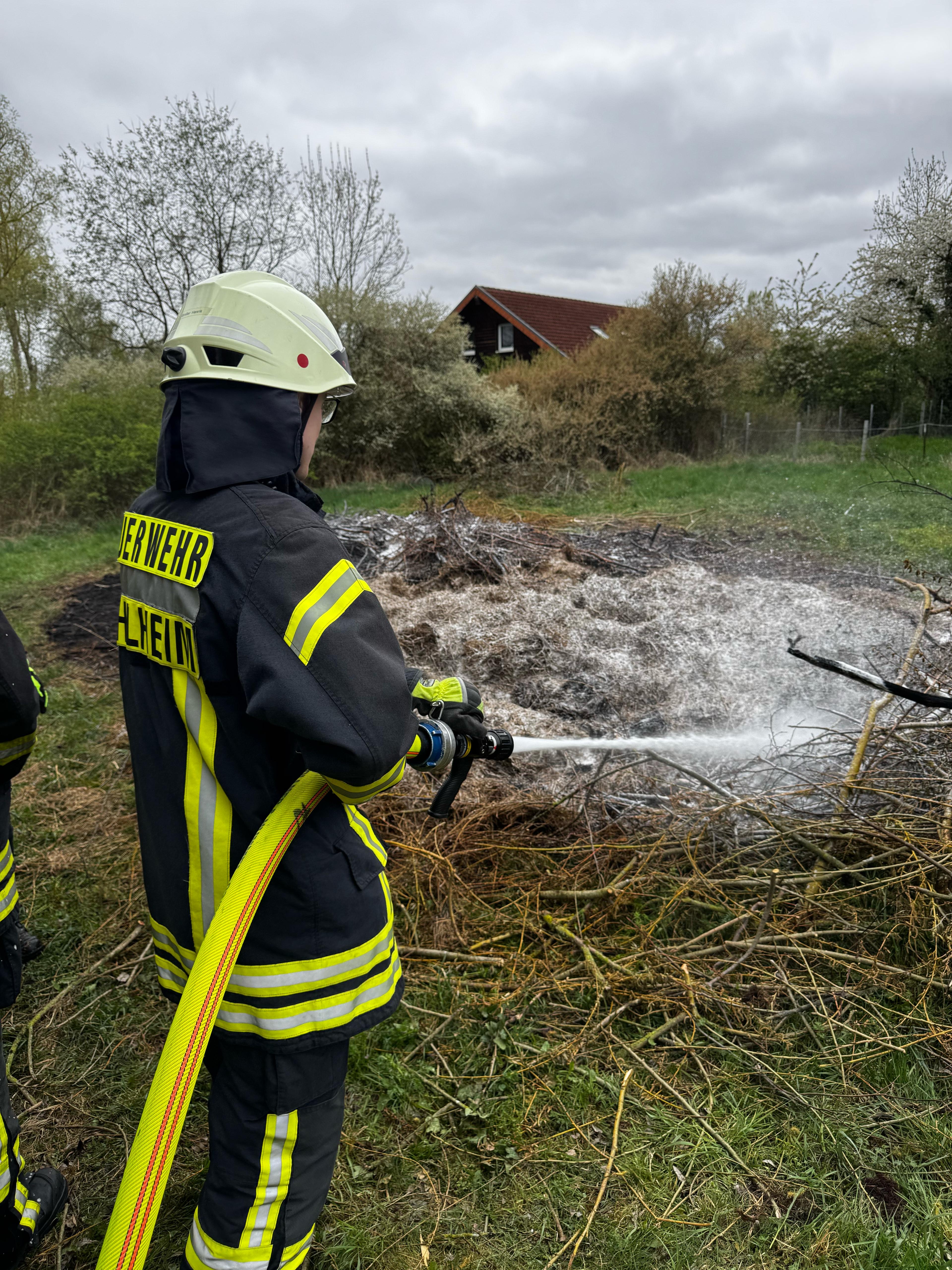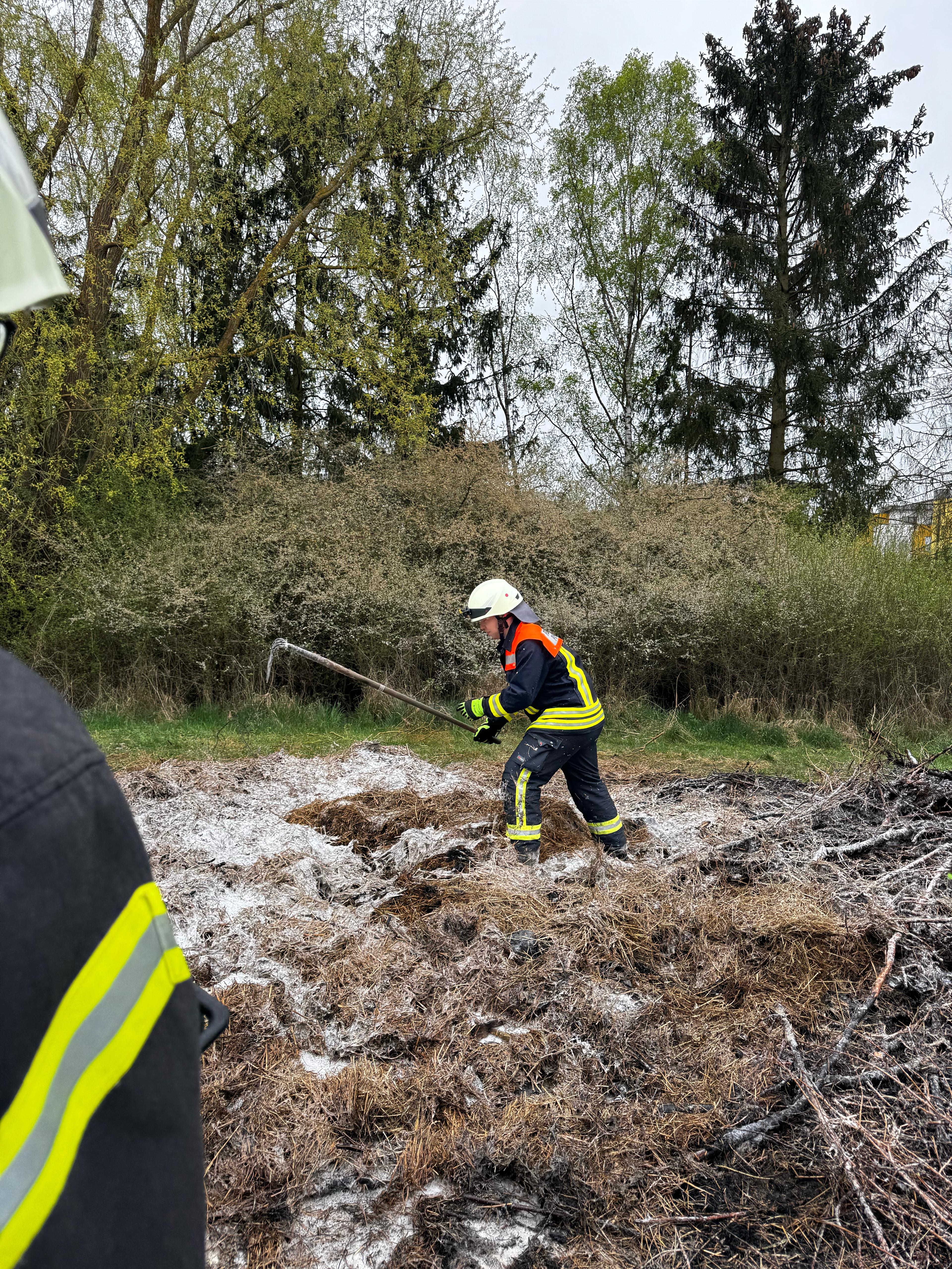 Ein Anrufer meldete eine erneute Rauchentwicklung bei der Brandstelle vom Vormittag. Das Brandgut wurde mit Dunghaken auseinandergezogen und mit Netzwasser abgelöscht.