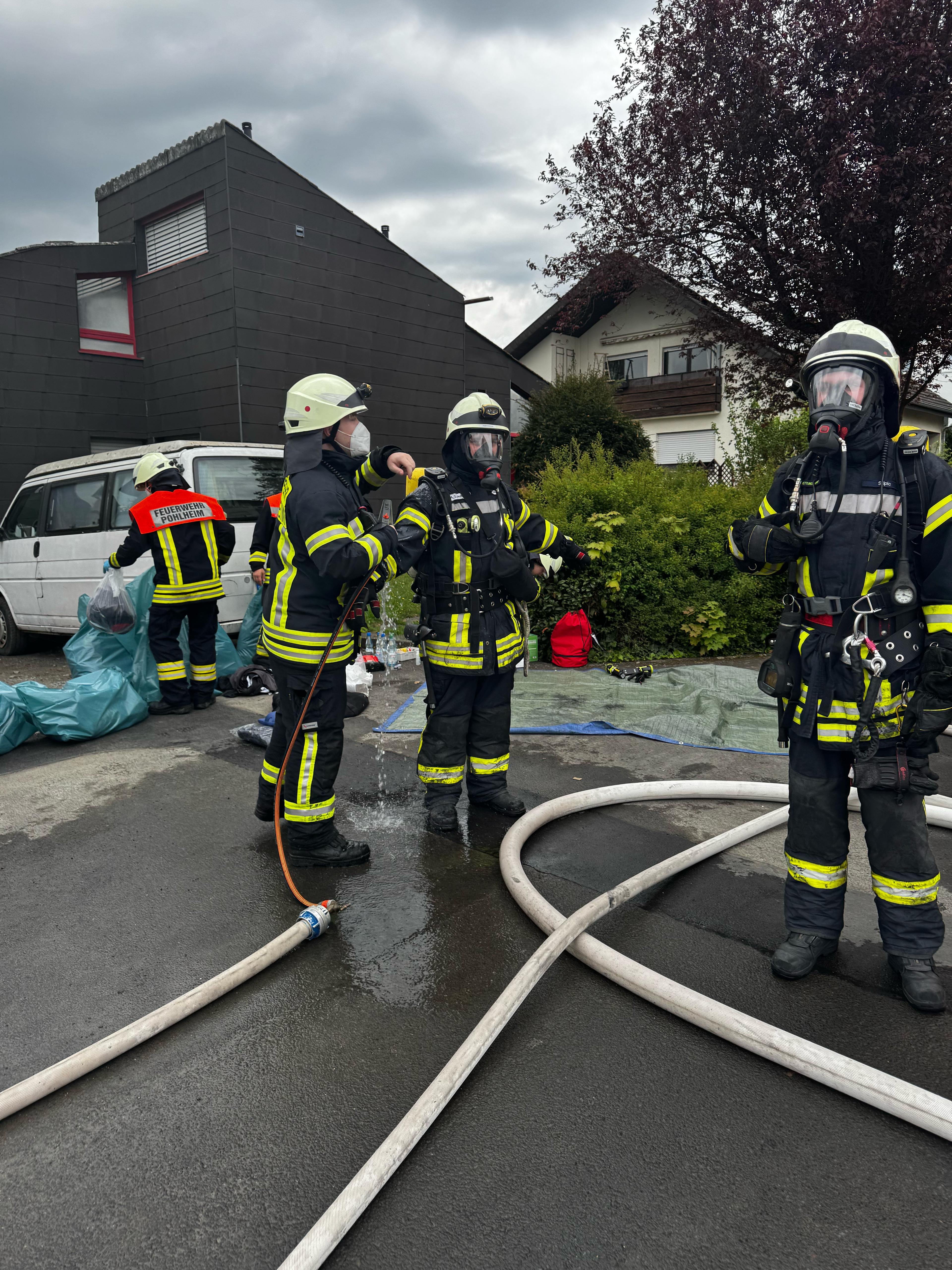 Ein erster Trupp unter Atemschutz ging unmittelbar zur Brandbekämpfung in den Keller vor. Aufgrund der starken Rauchentwicklung und der damit verbundenen Nullsicht kam der Trupp nur langsam voran, sodass zeitnah ein weiterer Trupp zur Unterstützung nachrückte. Kurz darauf wurden auch die Löschzüge Ost und Süd nachalarmiert, um zusätzliche Atemschutzgeräteträger an die Einsatzstelle zu bringen.
