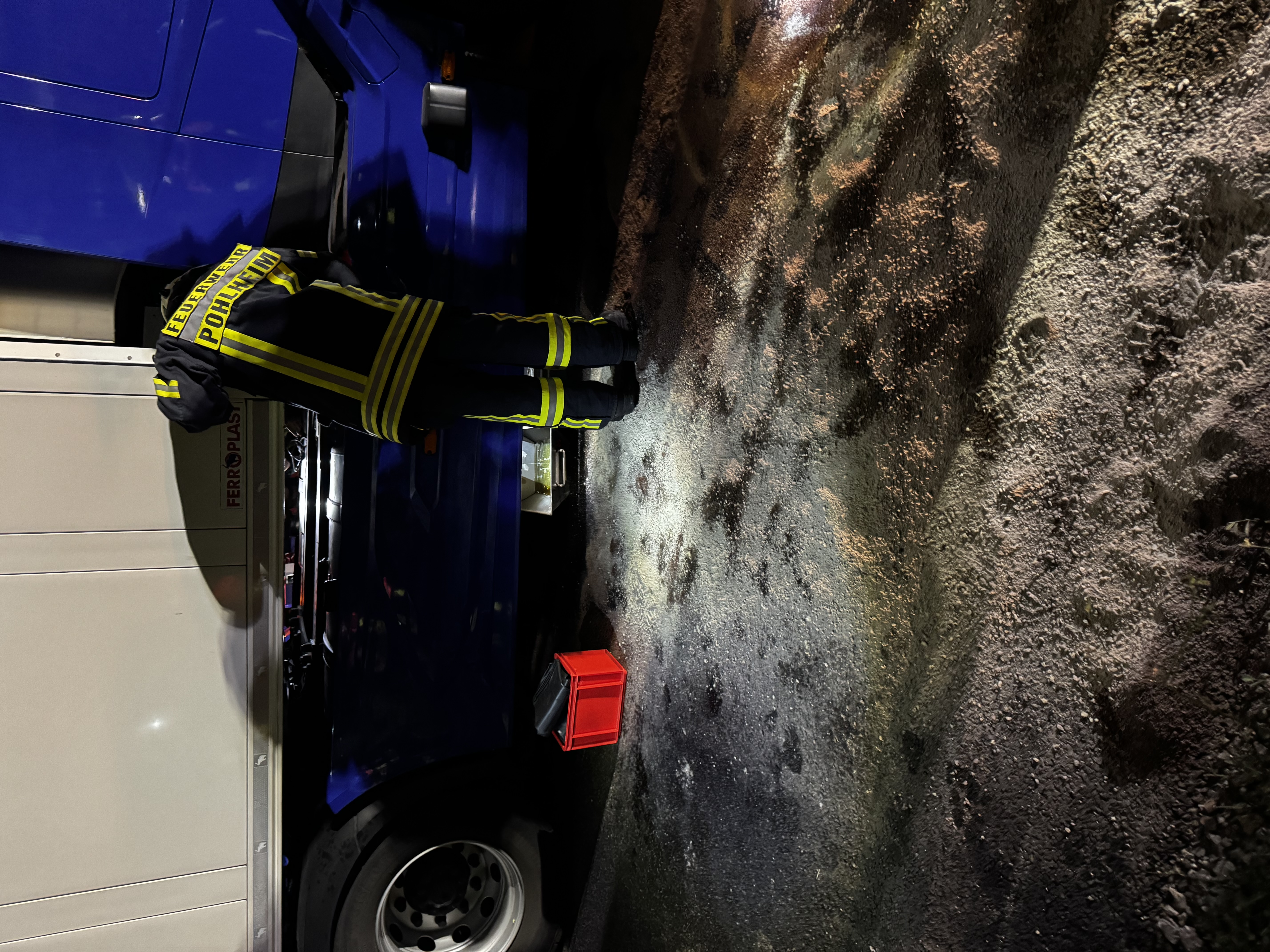 Der Tank auf der Beifahrerseite hatte ein etwa 5 cm großes Loch, aus dem der Diesel ungehindert in die Vegetation lief. Umgehend wurde eine Schuttmulde untergestellt und ein Damm aus Bindemittel errichtet, um eine weitere Ausbreitung zu verhindern. Parallel erfolgte die Nachalarmierung des Gerätewagens Logistik mit zusätzlichem Abdicht- und Auffangmaterial. Zur Sicherheit wurden der Beschleunigungsstreifen, der Standstreifen sowie die rechte Fahrspur voll gesperrt.