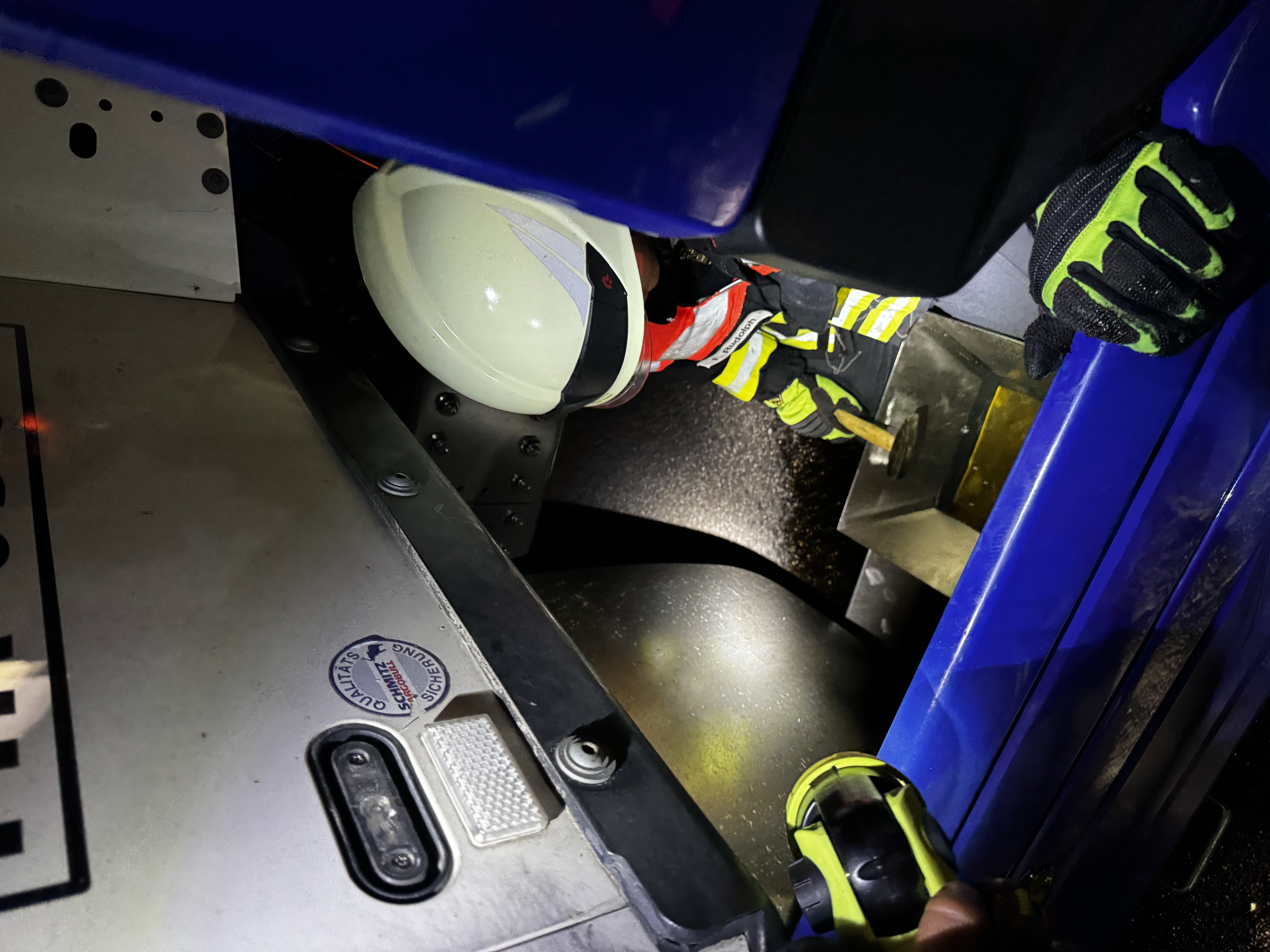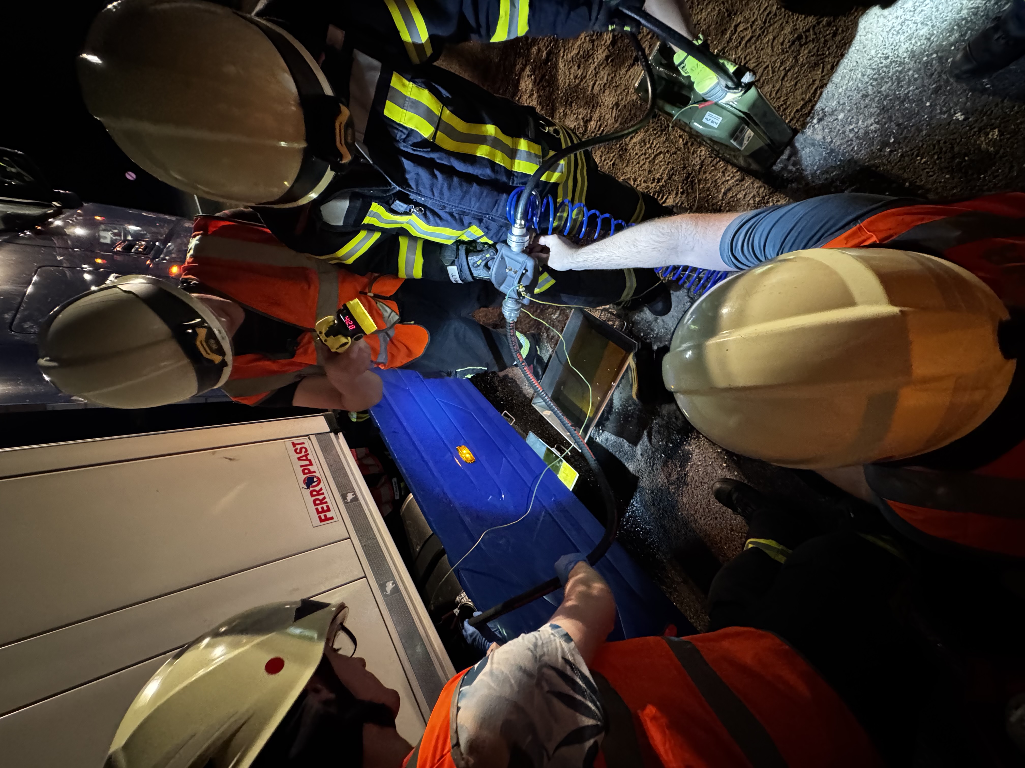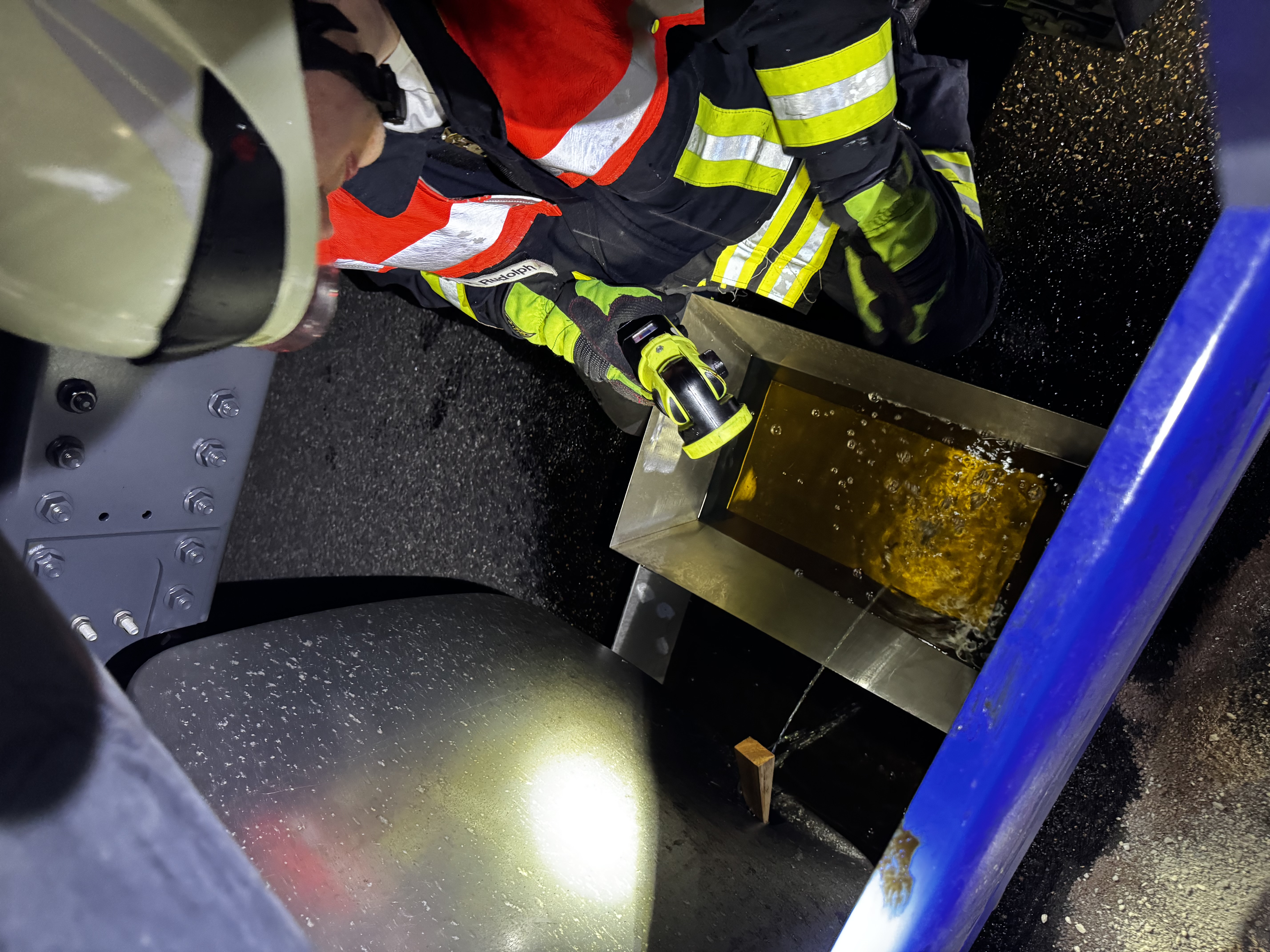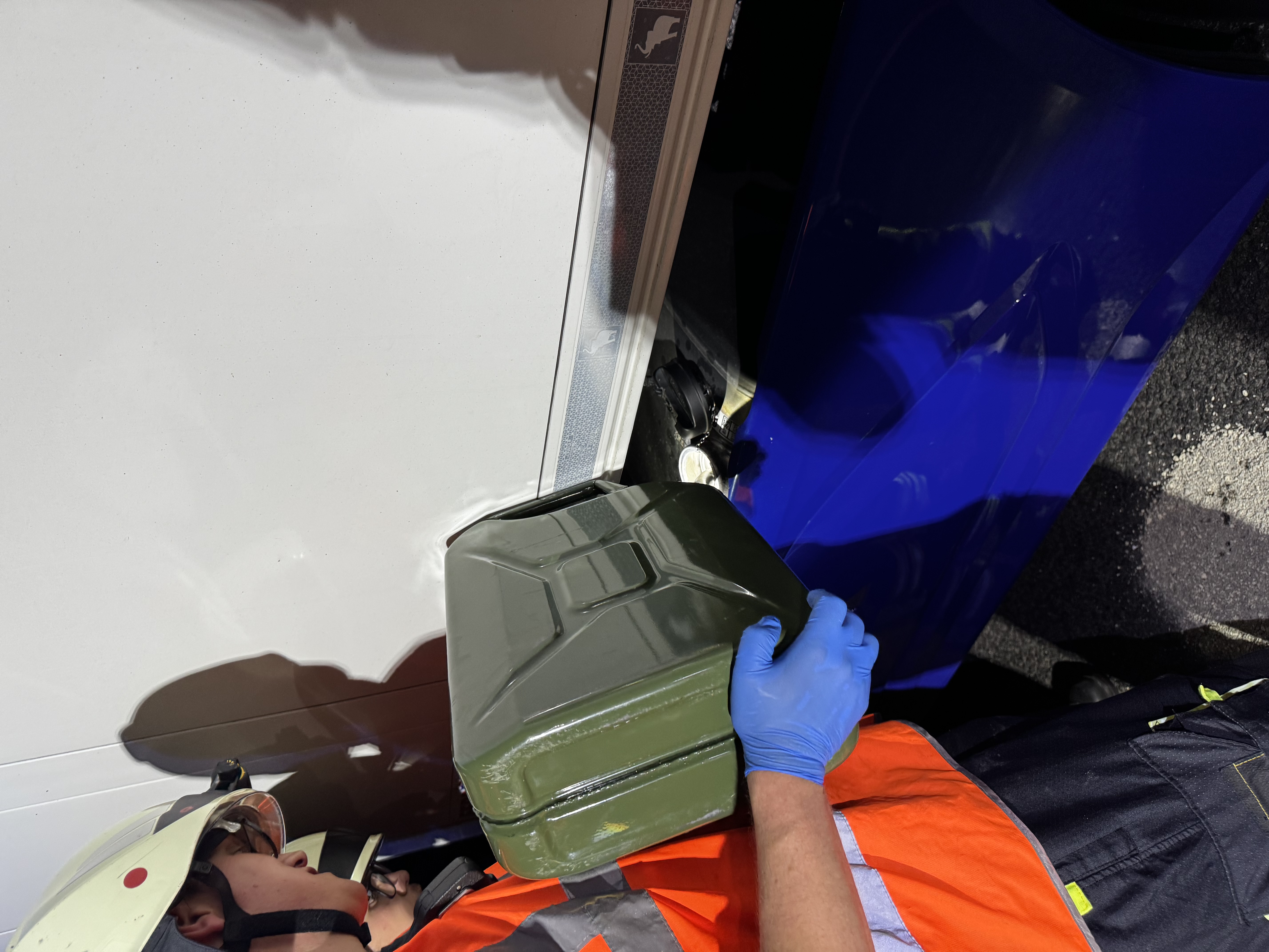 Das Leck konnte zunächst provisorisch mit einem Keil abgedichtet werden. Anschließend wurde der beschädigte Tank mithilfe einer Gefahrstoff-Umfüllpumpe Stück für Stück entleert: Der Diesel wurde zunächst in Kanister und von dort in den intakten Tank auf der Fahrerseite umgefüllt. Insgesamt konnten so rund 140 Liter Kraftstoff gesichert werden.